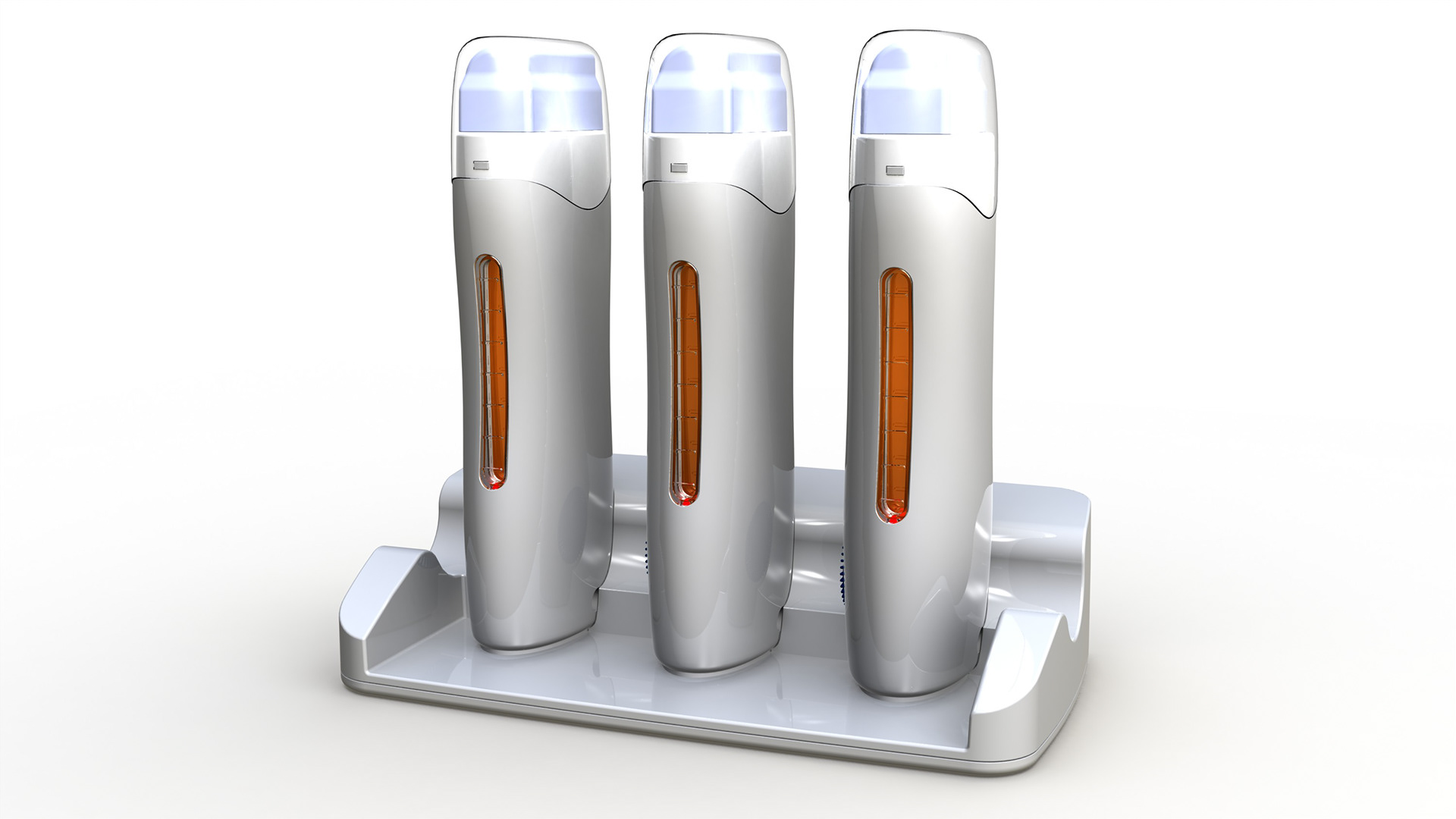 Two docking units were also part of the brief, created so the client can sell as a set and allowing two or three applicators to be heated simultaneously. The double unit heats two applicators and has provision for holding a pack of wax strips.
