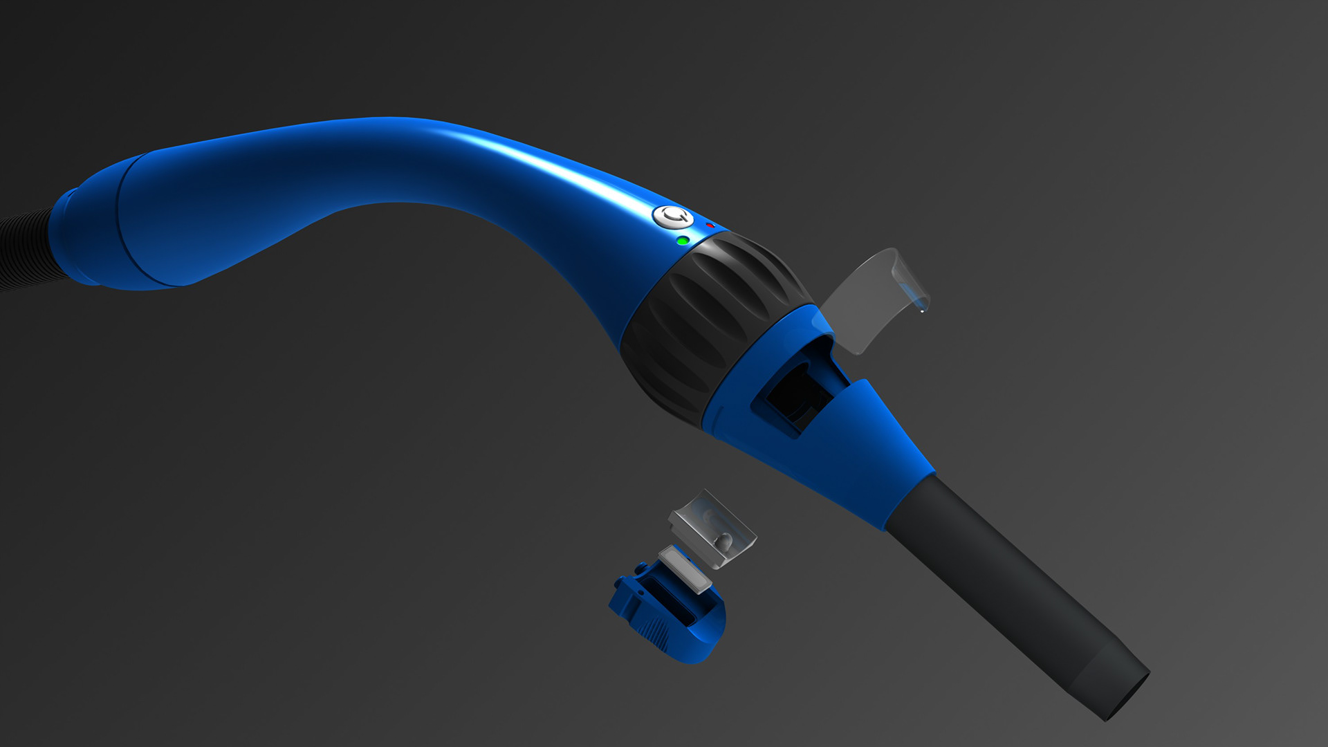 A unique water switch was developed for the wand handle that sent the water to enter the airflow either at the top of the wand handle or to the cleaning head at the floor. The water jet utilised a removable and cleanable water filtration system. Power was taken up to the wand handle through the air hose via an internal tube so that the on/off switch and LED indicators could be located on the wand. Detachable contacts were embedded into the hose break point at the cyclone opening.