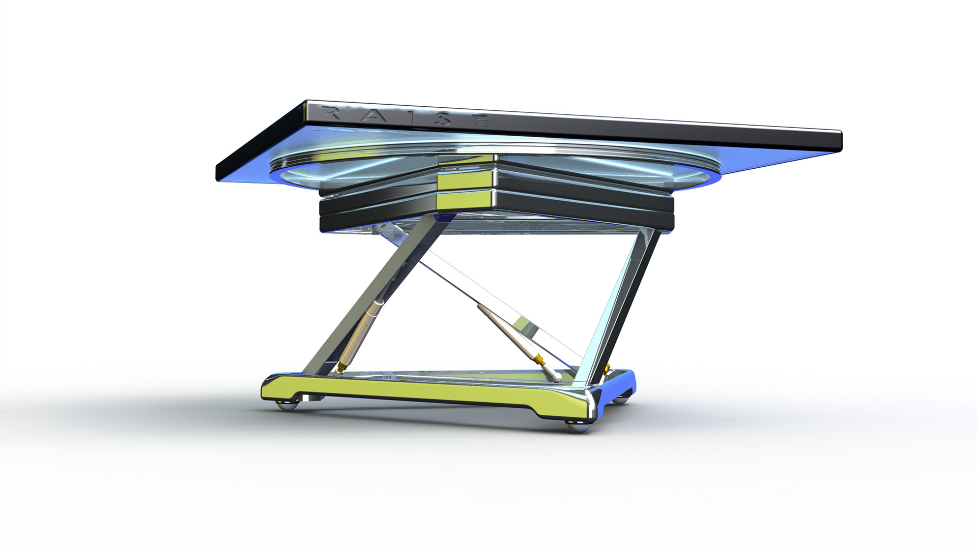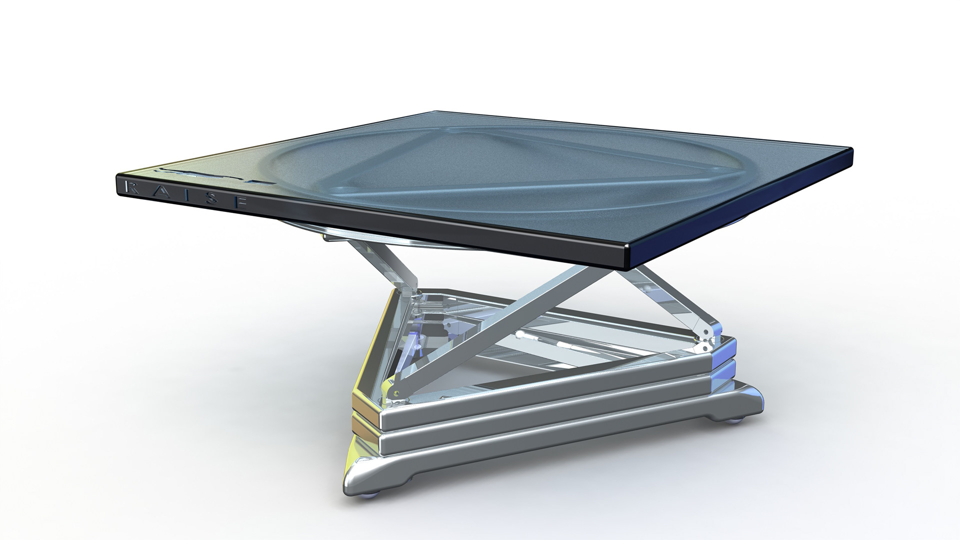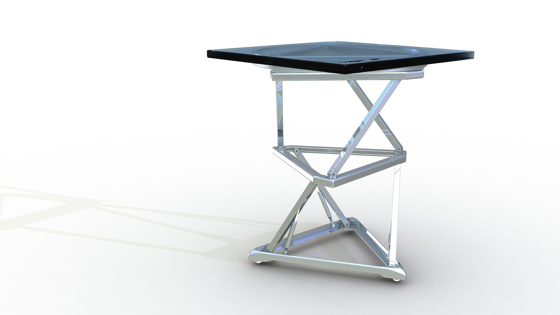 Concept development and CAD digital data of a multi-height commercial table for start-up Raise Design. The brief was to create a table that would be incredibly flexible in its' use, allowing a multitude of varible positions from coffee table, desk, and poser via a rotating tri-leg system that was repeatable, stackable.