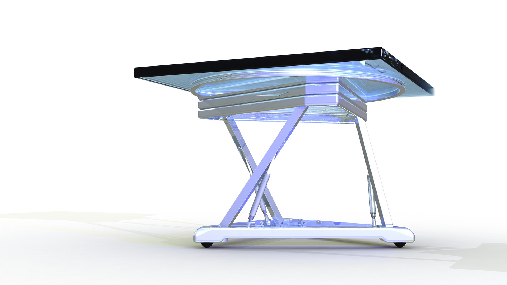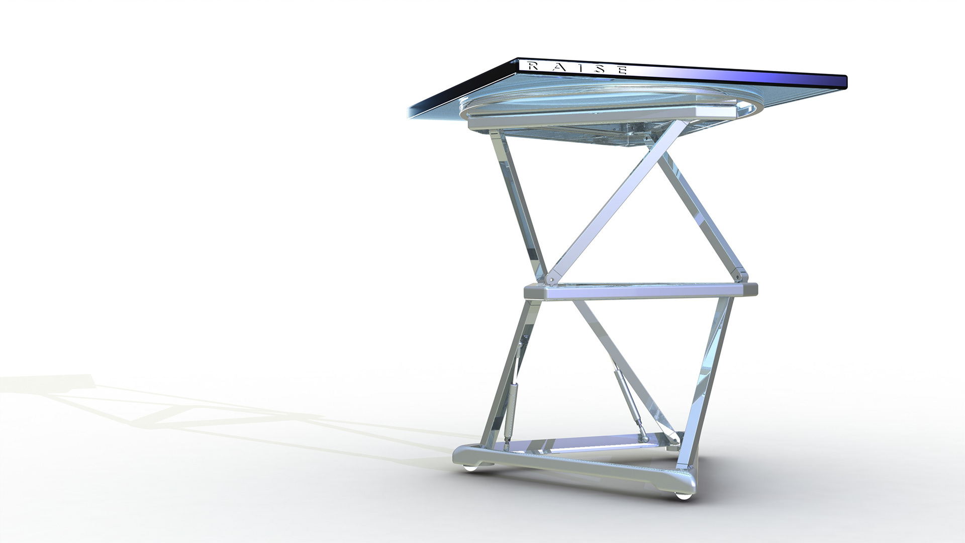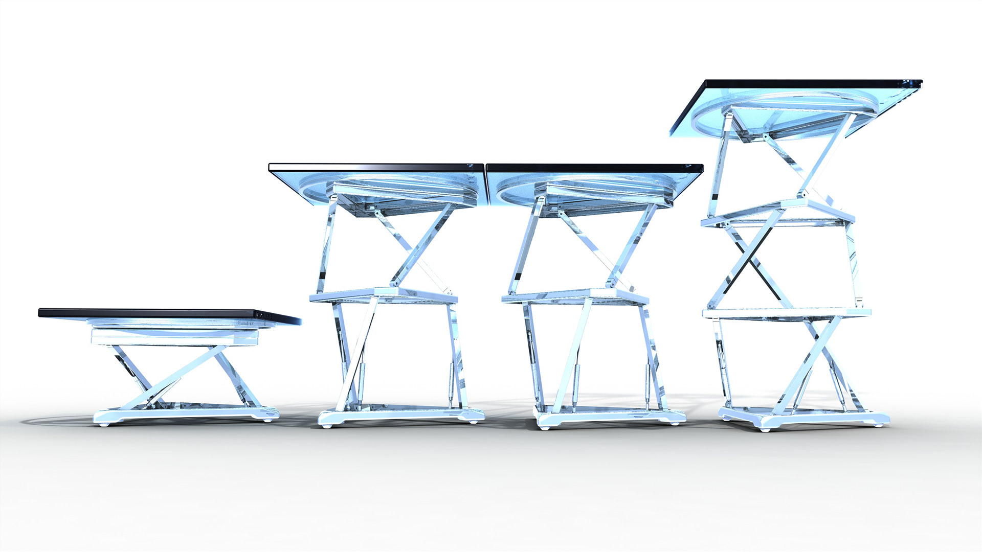 Concept development and CAD digital data of a multi-height commercial table for start-up Raise Design. The brief was to create a table that would be incredibly flexible in its' use, allowing a multitude of varible positions from coffee table, desk, and poser via a rotating tri-leg system that was repeatable, stackable.
